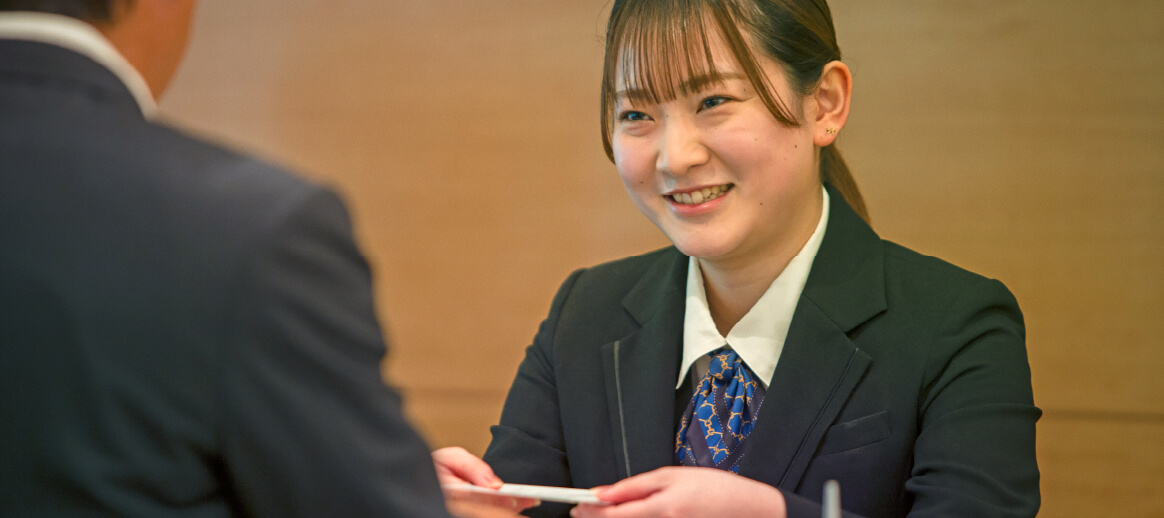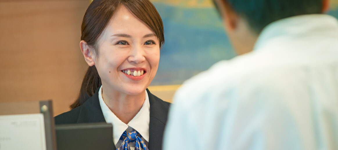 お客様の楽しい一日は、フロントでのチェックインから始まります。気持ちよくスタートいただけるよう、常に明るく笑顔で接するよう心掛けています。